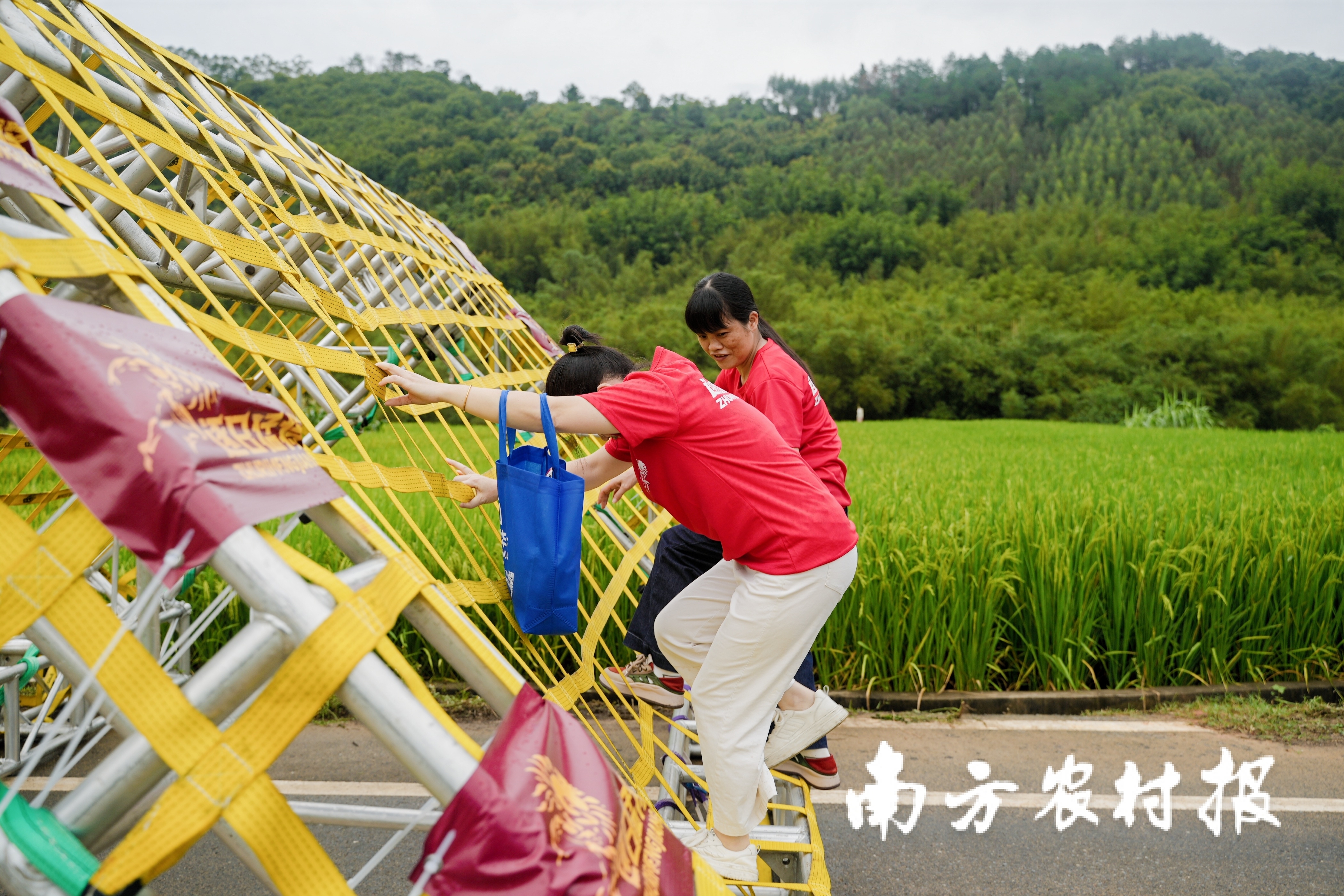 农民的节日农民乐。秋阳洒进台洞村湿地公园,欢乐丰收群众性互动游戏区早已热闹开了。丰收寻宝的人群攥着地图穿过翠竹长廊,有人端详任务卡,有人举着手机拍下台洞村之美与贺江碧道画廊的建设风采。不远处的吃鸡护照点,人们围着问答牌琢磨,期待在护照里集齐6个章可换小礼品一份。最让人沸腾的当属逐鸡比赛,乡亲们凭吃鸡护照入场,围满围栏,闸门一拉,杏花鸡扑棱着窜出,有人弓腰急追,有人绕篱堵截,围观者拍掌吆喝“往这边!”欢呼声顺着贺江水飘出老远。